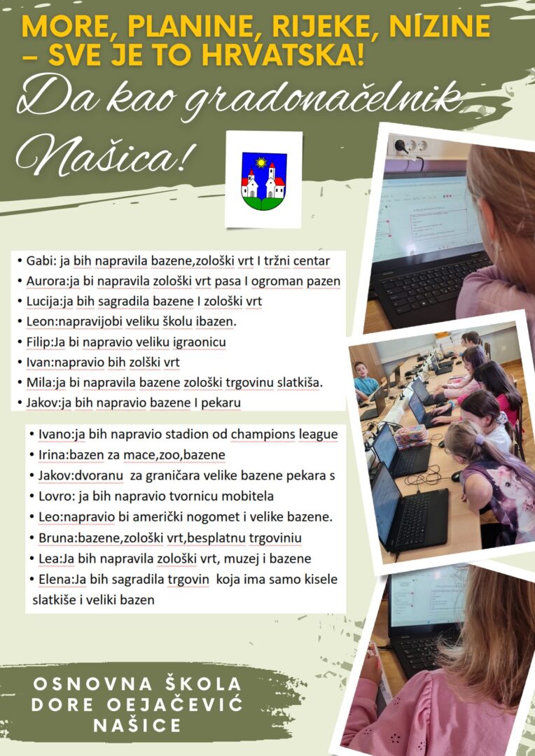 Tijekom prvog polugodišta učenici su u grupi projekta predstavili naš grad Našice, njegovu kulturnu baštinu i Doru Pejačević te istraživali jezik i izraze našeg zavičaja. Neke od aktivnosti koje smo proveli i izradili materijale: Edukativna slikovnica o našičkom kraju; N kao Našice; Maketa grada Našica; Biljke i životinje u našičkom kraju; “Čuvamo školu i okoliš oko nje“. Posebno zanimljivo iskustvo učenicima je bio edukativni posjet Zavičajnom muzeju Našice. Završno druženje u polugodištu, počastili smo se zakuskom i grickalicama!