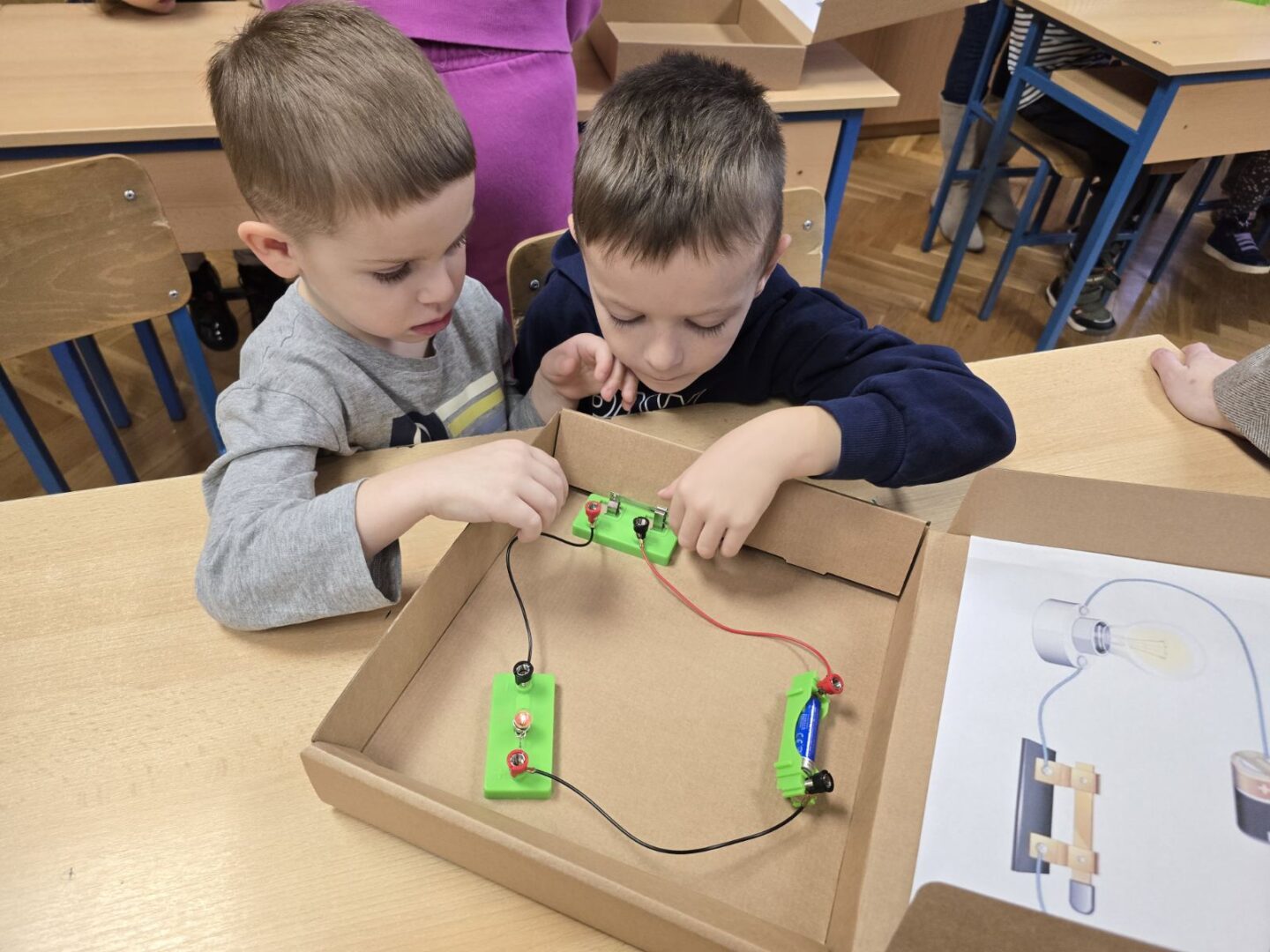 Za polaznike skupine Staklena poseban je doživljaj bio posjet iznenađenja prvašića 1.b I 1.c razreda uz njihove učiteljice Danielu Vidaković i Marinu Mihalj. Sljedećeg dana posjetila nas je skupina Kruška  gdje su uz vodstvo odgojiteljica Valentine Dervić i Viktorije Vladika istraživali temu Struja. Upoznali smo ih s likom i djelom Nikole Tesle kroz kratku i pristupačnu priču, a zatim smo im kroz igrokaz prikazali od čega se sastoji jednostavan strujni krug. Djeca su aktivno sudjelovala, postavljala pitanja i pokazala veliko zanimanje za svijet elektriciteta. Ovakav oblik suradnje između škole i vrtića, već drugu godinu za redom, pokazao se iznimno vrijednim – djeca kroz igru i istraživanje razvijaju znatiželju, kritičko mišljenje i ljubav prema STEM području već od najranije dobi. Zahvaljujemo odgojiteljicama i veselimo se nastavku suradnje te novim zajedničkim znanstvenim pustolovinama! Provedene aktivnosti možete pronaći na priloženim fotografijama.