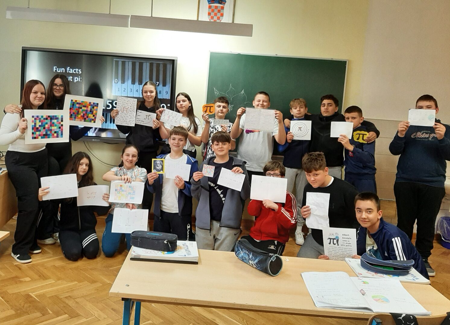 Naši su učenici s učiteljicom Irenom Turjak izradili slikovite prezentacije o povijesti broja pi, prisjetili se slavnog Arhimeda koji je približnu vrijednost broja pi zapisivao pomoću razlomka jer stari Grci nisu poznavali decimale, a po uzoru na Ruđera Boškovića pisali su pjesme i izreke prema pravilima pi jezika. Proslavili su rođendan Alberta Einsteina (14. 3. 1879.), jednog od najpoznatijih svjetskih fizičara. Slušali su glazbene interpretacije broja pi, stvarali likovne prikaze broja pi i pokušali se prisjetiti što više pi riječi. Jedna od najzanimljivijih i najtežih aktivnosti je recitiranje decimala broja pi napamet. Na natjecanju u recitiranju decimala broja pi ove je godine najuspješnija bila Iskra Baričević iz 7.a razreda sa zapamćenih čak 113 znamenki, a slijede je Fran Miličević iz 7.d s 51 i Nola Barišić-Jaman iz 7.c s 47 znamenki. Čestitamo!
