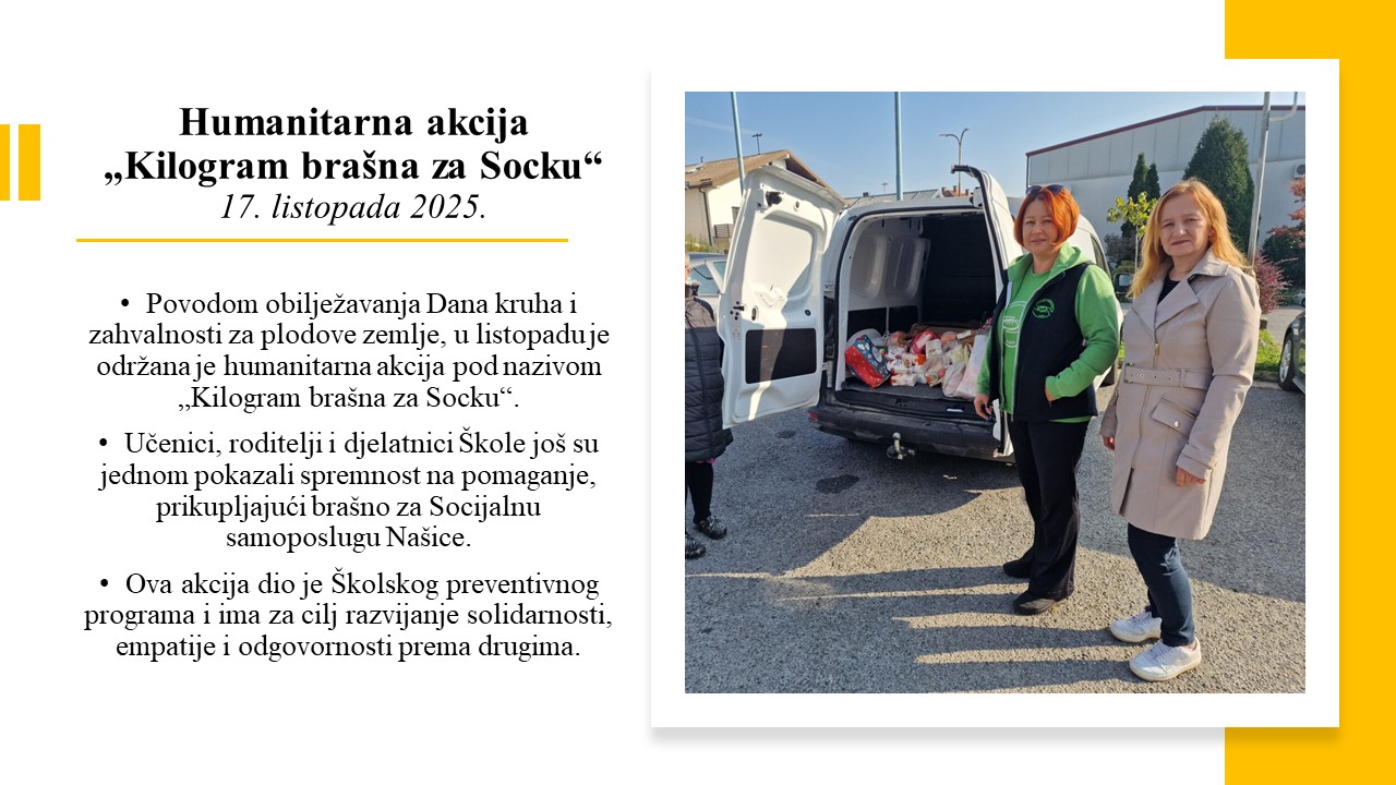 Povodom Dan kruha i Dana siromaštva organiziramo prikupljanje brašna i namirnica za Socijalnu samoposlugu, pod nazivom „Kila brašna za Socku“. Akciju provode Mali volonteri i vjeroučiteljica Anica Bolanča.