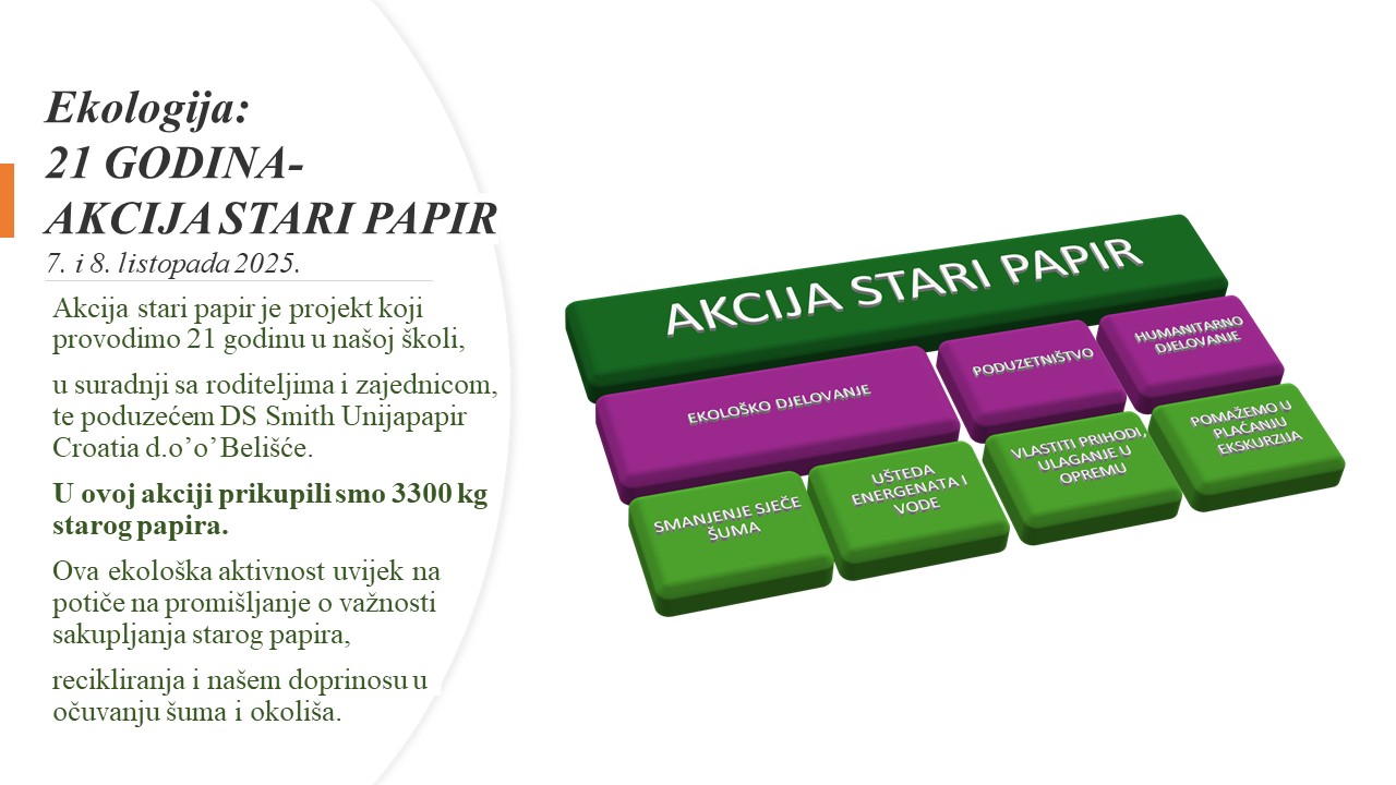 Tijekom školske godine provodimo Akciju stari papir – prikupljanja starog papira u suradnji s poduzećem DS Smith Unija-papir Croatia. Akcije se održavaju u rujnu i lipnju. Učenici, roditelji učenika i ostali građani donose prikupljeni papir, a dobivena sredstva ulažemo u rad sekcija i kao pomoć za plaćanje ekskurzija potrebitim učenicima.