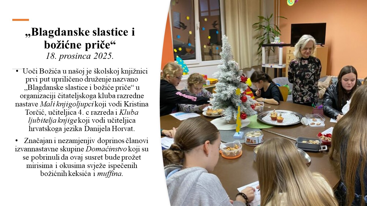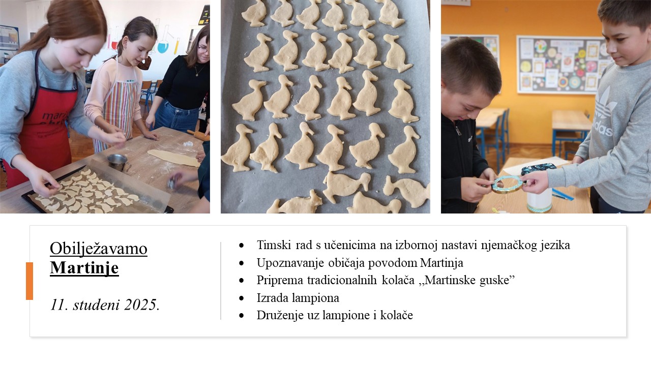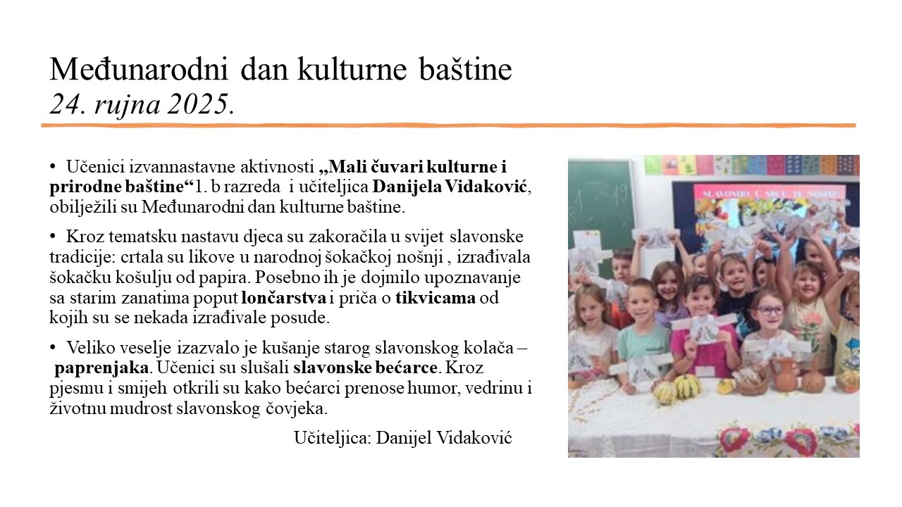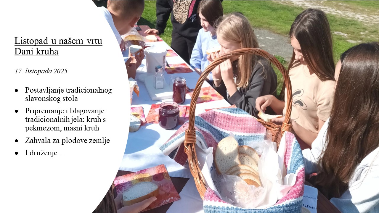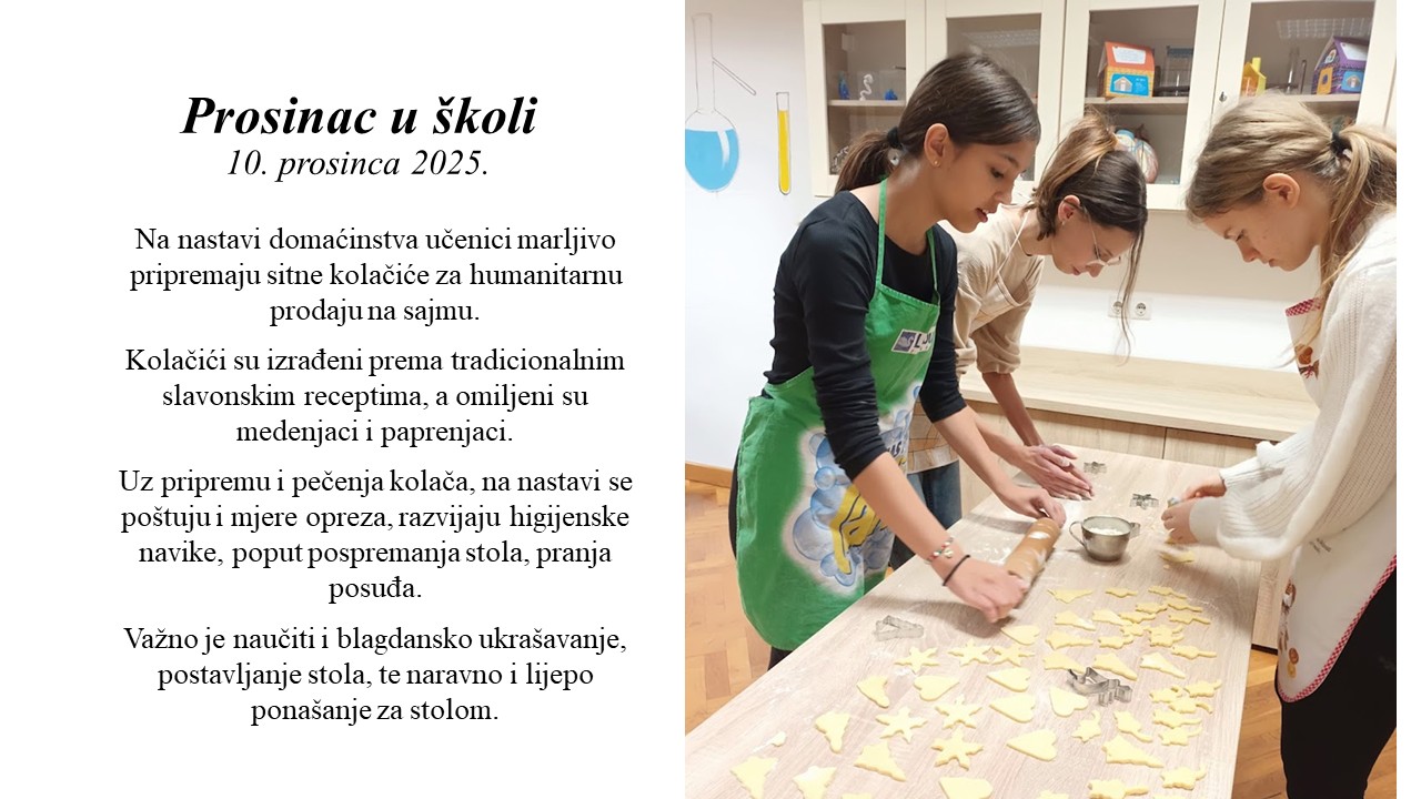 Školski projekt pod nazivom „Tradicija na blagdanskom stolu“ se ostvaruje s ciljem promicanja i očuvanja tradicije i kulturne baštine našeg kraja, razvoja praktičnih vještina učenika u školi, suradničkog i iskustvenog učenja. Učenici na nastavi Domaćinstva istražuju i pripremaju tradicionalna slavonska jela, namirnicama iz našeg podneblja s ciljem prihvaćanja tradicionalnih jela kao zdravog oblika prehrane. U vrijeme Adventa istražujemo tradicijski Božićni slavonski jelovnik, postavljanje i ukrašavanje blagdanskog stola, tradicijske slavonske Božićne kolače: medenjake, paprenjake…