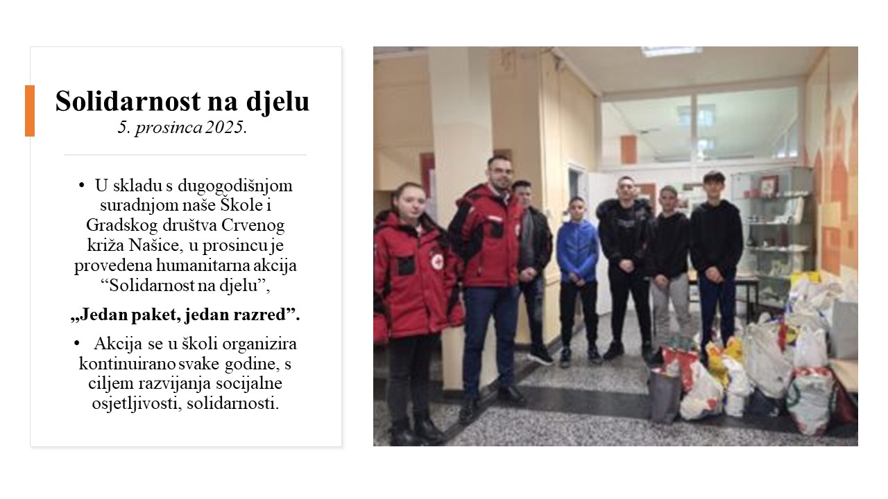 Povodom dana Sv. Nikole, za potrebe Crvenog križa prikupljamo zimsku dječju odjeću, igračke, a prikupljanjem namirnica i higijenskih potrepština sudjelujemo u humanitarnoj akciji „Jedan razred -jedan paket“.