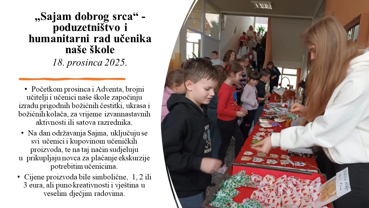 Uoči božićnih blagdana, organiziramo humanitarnu akciju pod nazivom: „Sajam dobrog srca“.