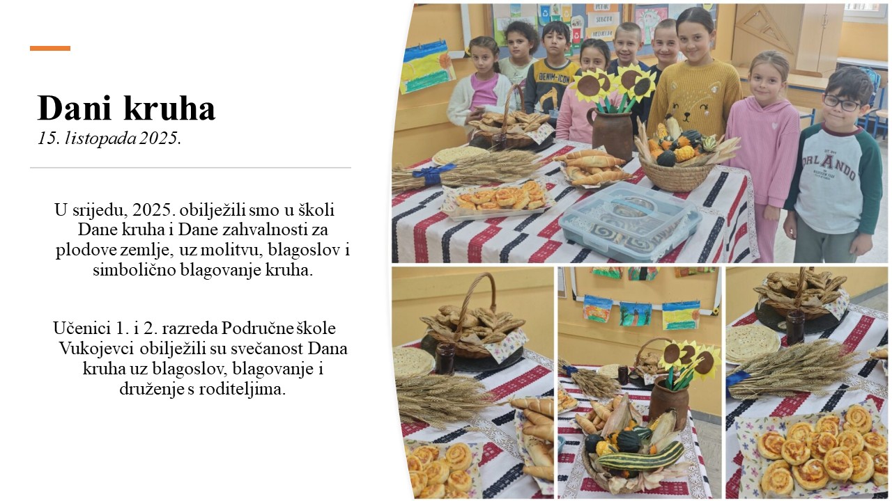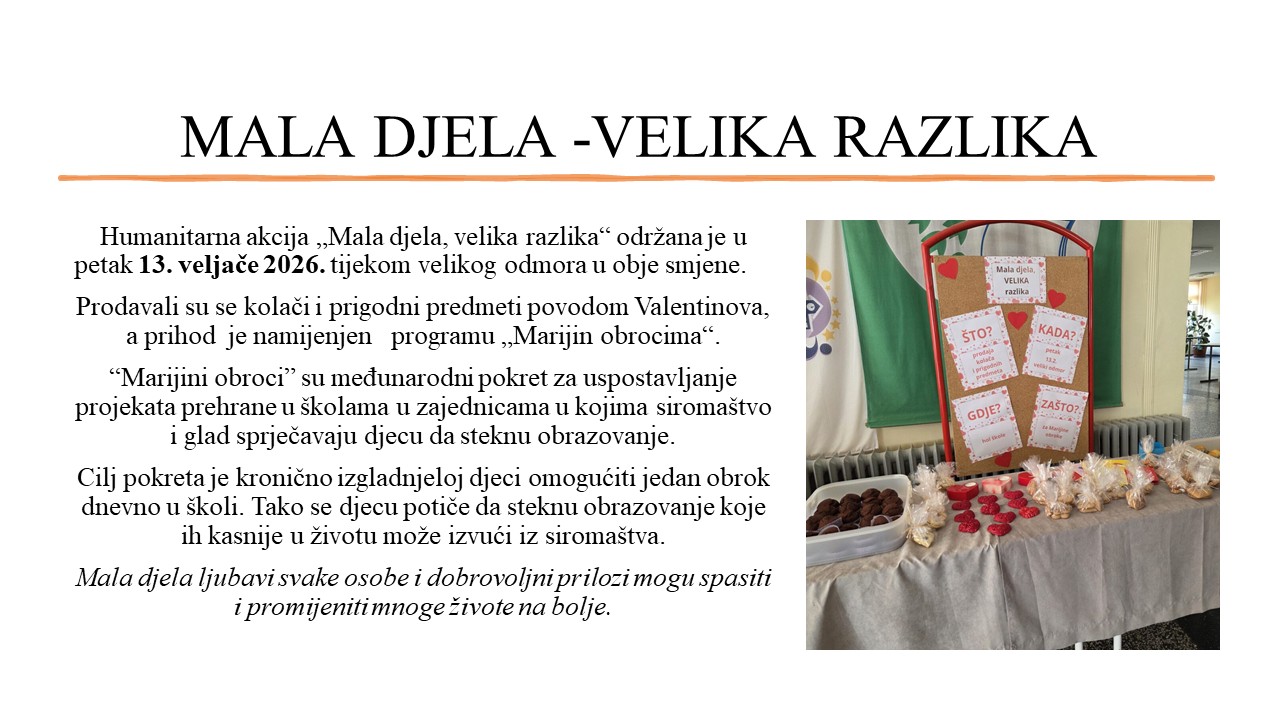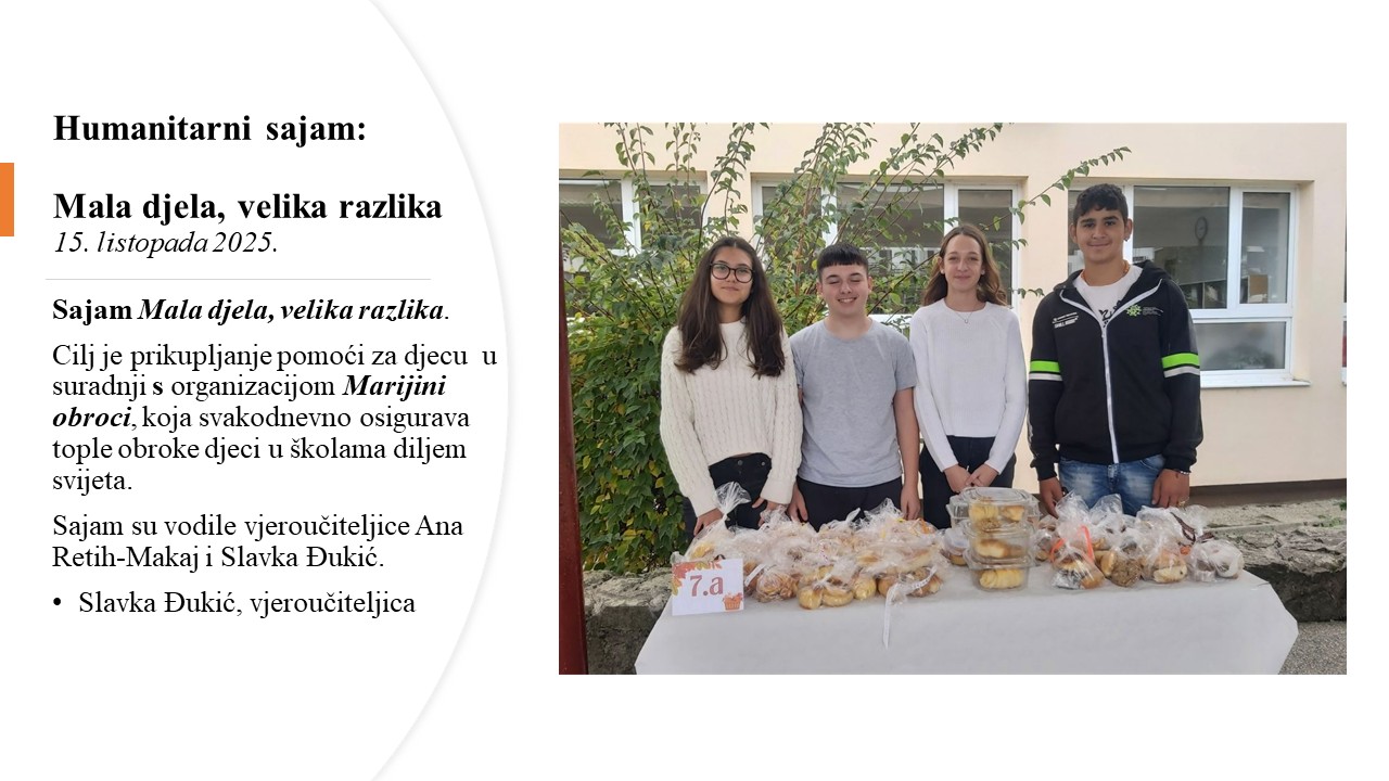 Povodom Dana kruha, vjeroučiteljice Ana Retih Makaj i Slavka Đukić, organiziraju humanitarnu akciju za pomoć djeci Afrike, pod nazivom „ Mala djela, velika razlika“ u organizaciji Mariji obroci.