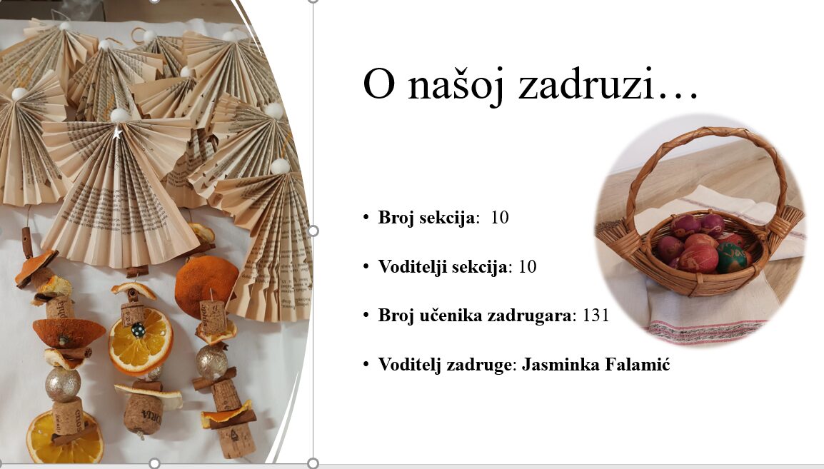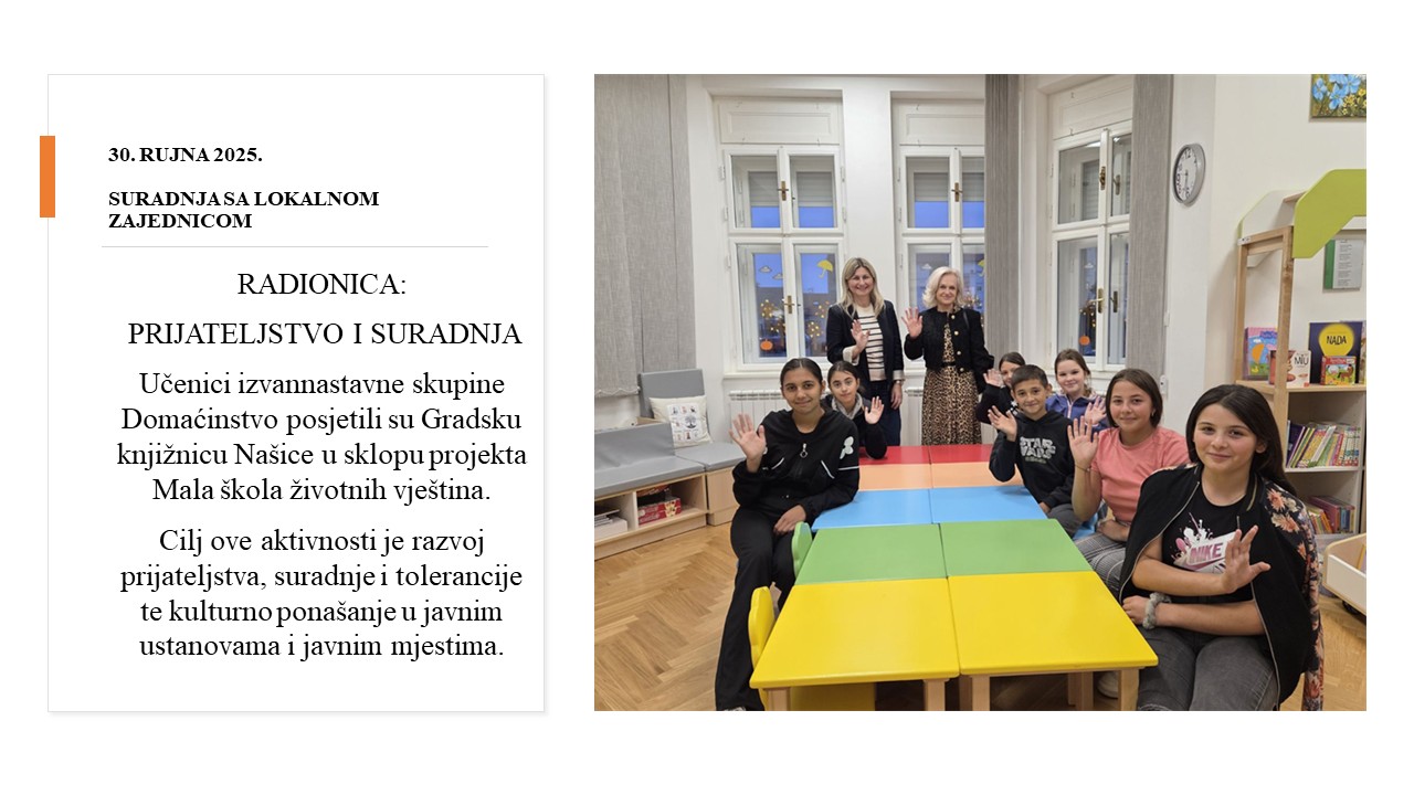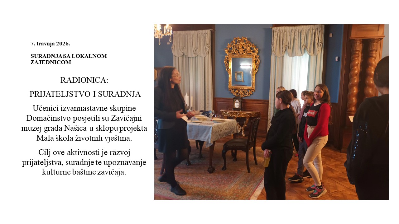 Ove školske godine provodim o projekt „Mala škola životnih vještina“ s učenicima na nastavi Domaćinstva, s ciljem razvoja praktičnih vještina i socijalnih kompetencija koje će pridonijeti boljem životnom uspjehu i životu u zajednici. Uz brojne praktične radionice u školi, planiramo i terenske posjete javnim ustanovama u lokalnoj sredini, gradskoj knjižnici Našice i Zavičajnom Muzeju grada Našica, te posjet Muzeju bećarca u Pleternici. Učitelji će sudjelovati na edukacijama i provoditi radionice i promotivne aktivnosti. Projekt će poticati učenike na uključivanje u poduzetničke aktivnosti i humanitarno djelovanje, te podizanje svijesti o kulturnom i nacionalnom identitetu.