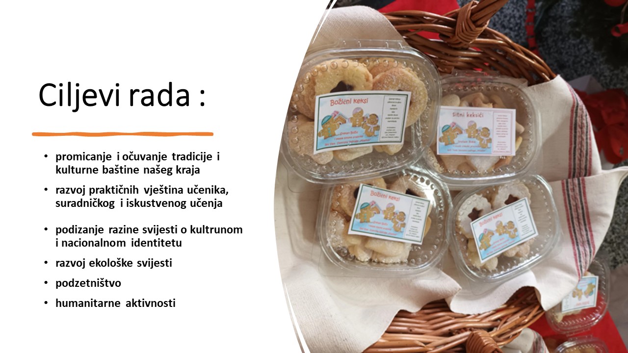 Cilj je izradom učeničkih proizvoda razijati svijest o očuvanju prirodne i kulturne baštine, vlastitom osobnom razvoju, doprinosu zajednici i pomoći potrebitima. Uoči sajma, učenici izrađuju brojne prigodne proizvode, čime stječu vještinu praktičnog rada i radne navike, razvijaju interes humanitarni rad i društveno djelovanje. Ostvareni prihod namijenjen je za za humanitarnu pomoć potrebitim u učenicima, te budući rad sekcija zadruge.